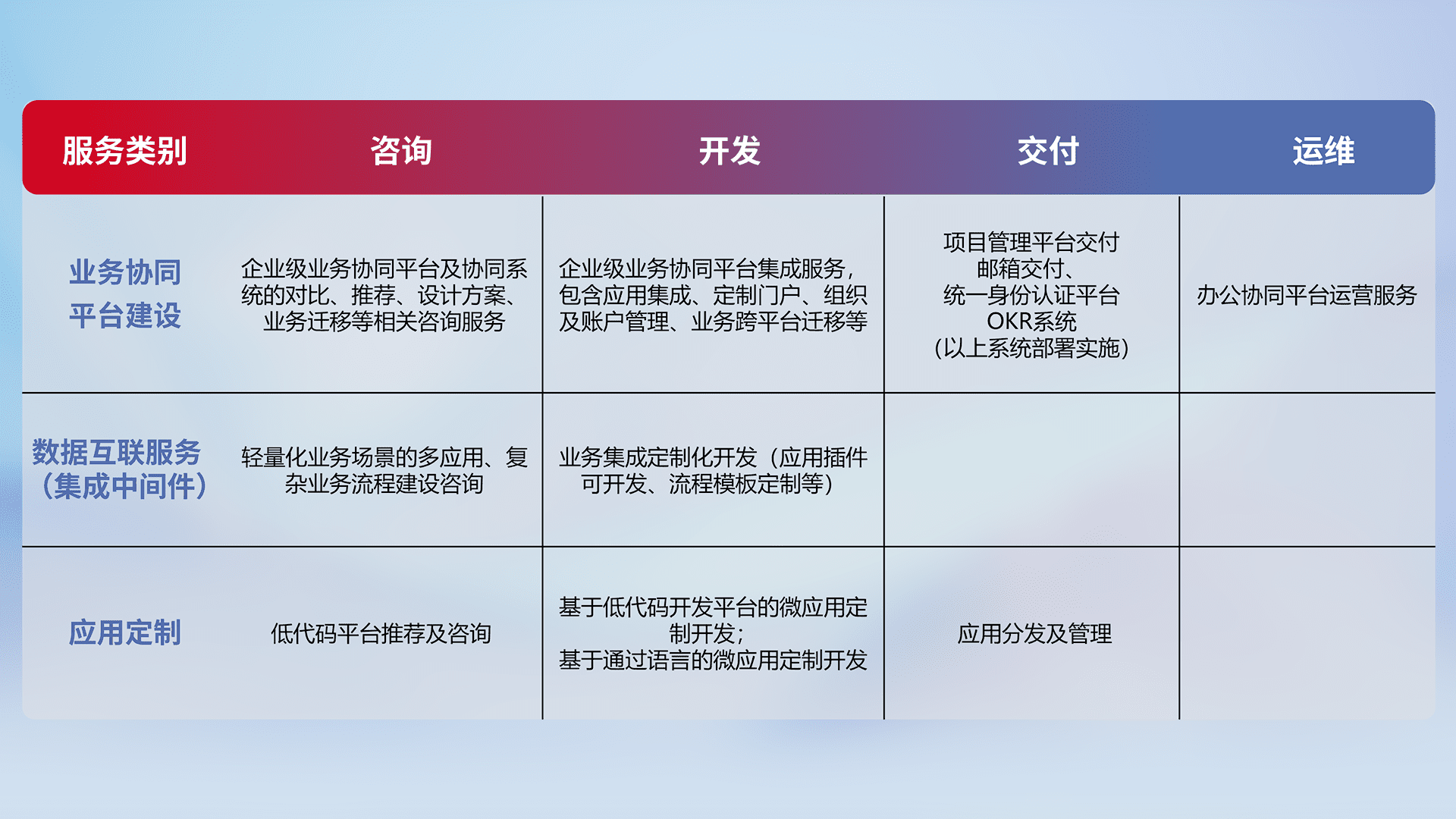 针对钉钉、、企微、、IDaas等平台级产品提供产品的规划、、、方案、、、、交付、、、定制化开发等服务,,实现如统一协同办公、、智能客户服务、、混合会议管理、、智能数据查询、、、等业务场景,,,,实现数字化转型。。。。