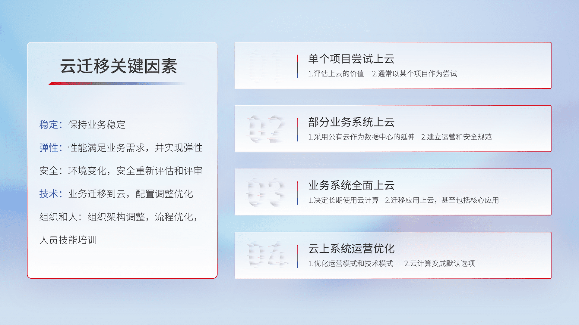 结合实际业务,,从规划设计、、云平台选型、、、、云原生改造、、、数据迁移、、、、集成交付,,,迁移全过程为客户识别最佳上云路径,,,,做好风险识别管理,,,,设计网络架构、、、身份权限、、、安全审计合规、、、操作审计、、、、日志审计、、、、监控告警策略、、多站点容灾设计等,,,对云上基础设施进行整体规划,,,,提升IT治理水平,,,以满足弹性、、、、高可用、、、高性能的需求。。。