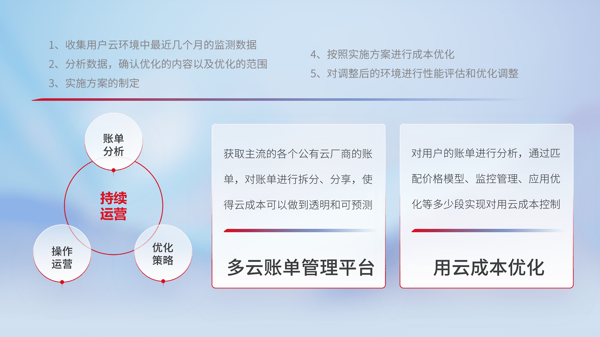 通过多云纳管,,,,以统一的资源数据模型把客户的云资源进行抽象和封装,,进而实现对多云资源的统一操作,,,保障云资源管理的可靠性、、、稳定性与可用性。。。。量身定制化运维内容,,,配置、、、开发运维、、补丁管理、、备份、、、监控、、认证和访问管理、、审计和日常巡检等,,,保障在用云过程中的可靠度,,,,稳定度以及高可用率。。。。