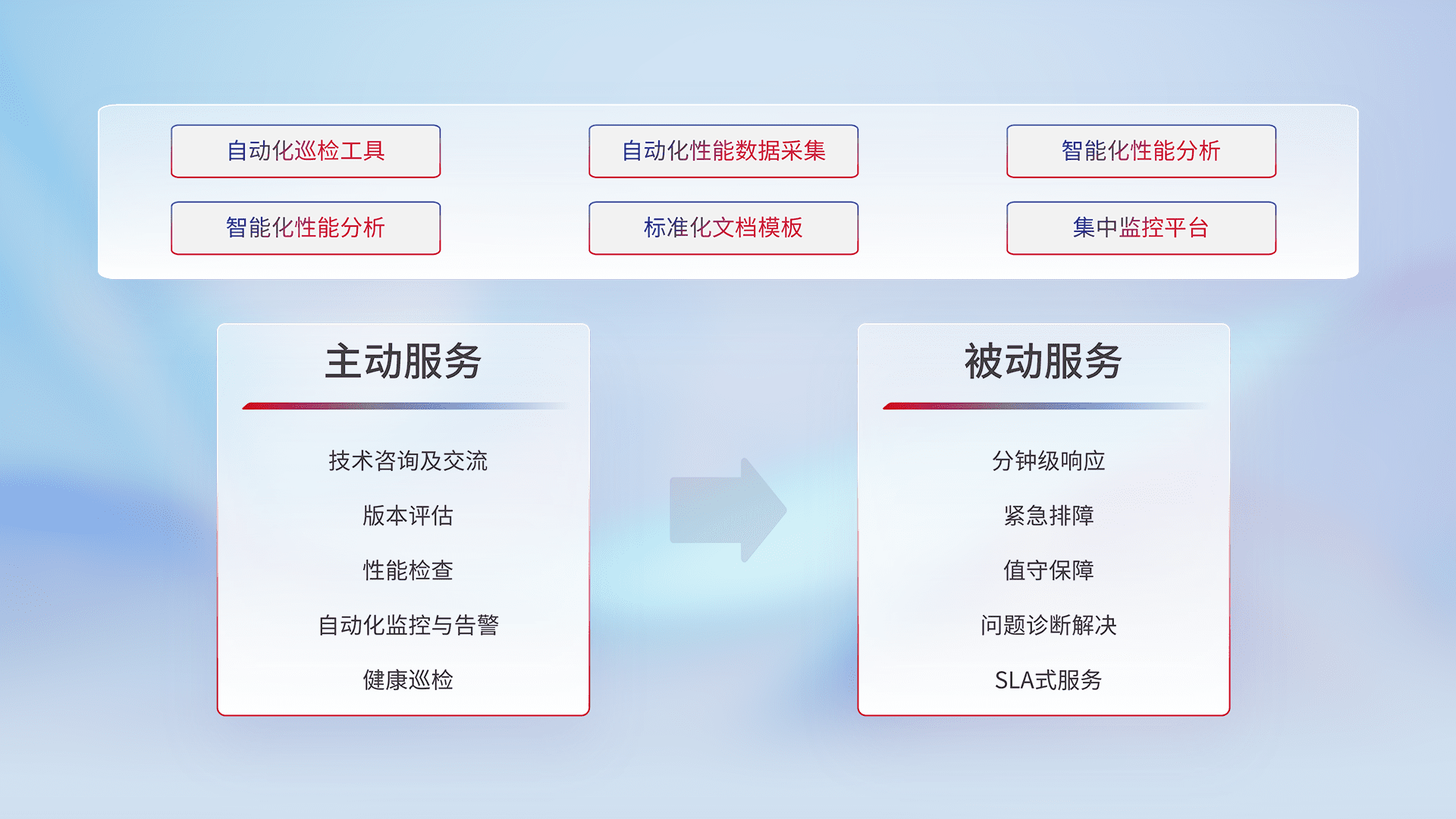 智能化工具和标准化文档,,,保障服务质量,,,提供主动服务(包含技术咨询、、版本评估、、、、性能检查、、、自动化监控与告警、、、健康巡检)和被动服务包含(分钟级响应、、、、紧急排障、、、值守保障、、问题诊断解决、、SLA服务)。。。。