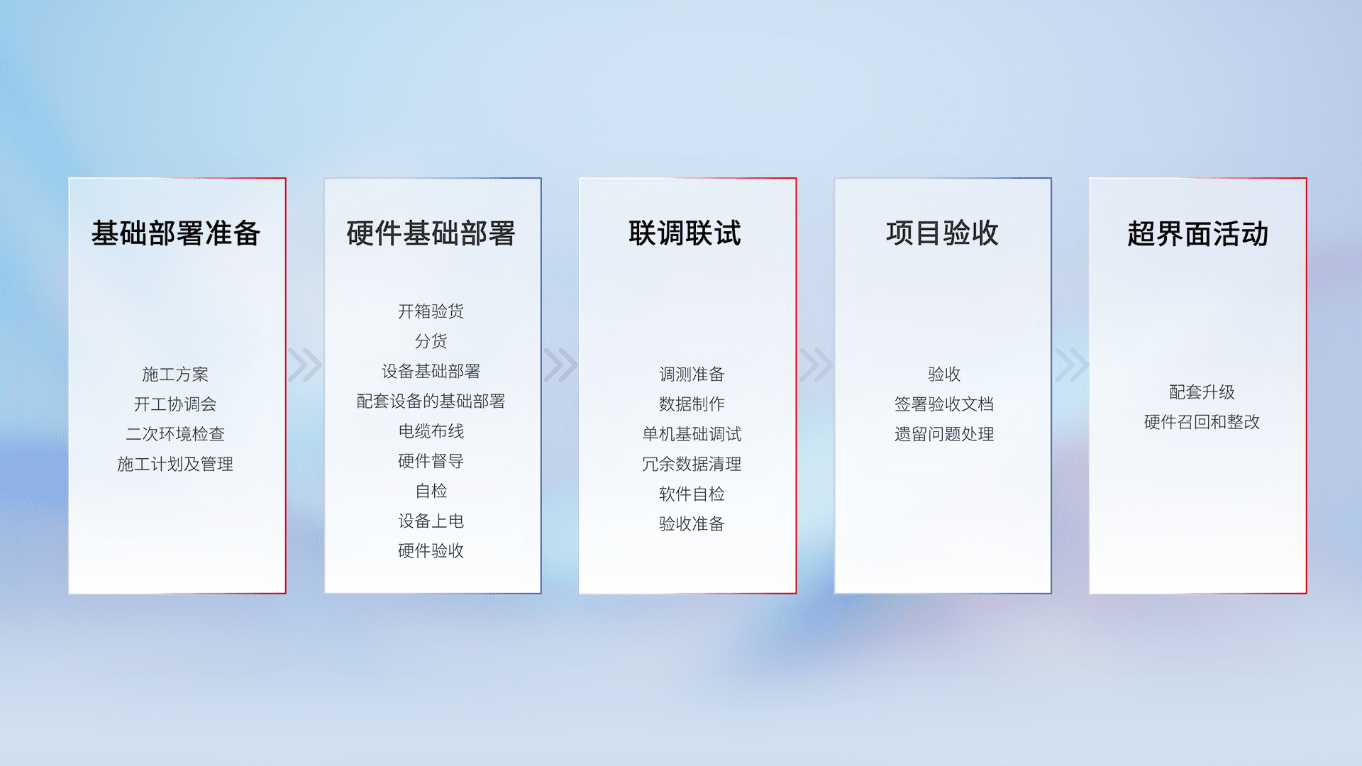 从基础部署准备、、、、硬件基础部署、、联调联试、、、项目验收、、、越界面活动的全过程可追溯,,,保证施工质量和进度。。。